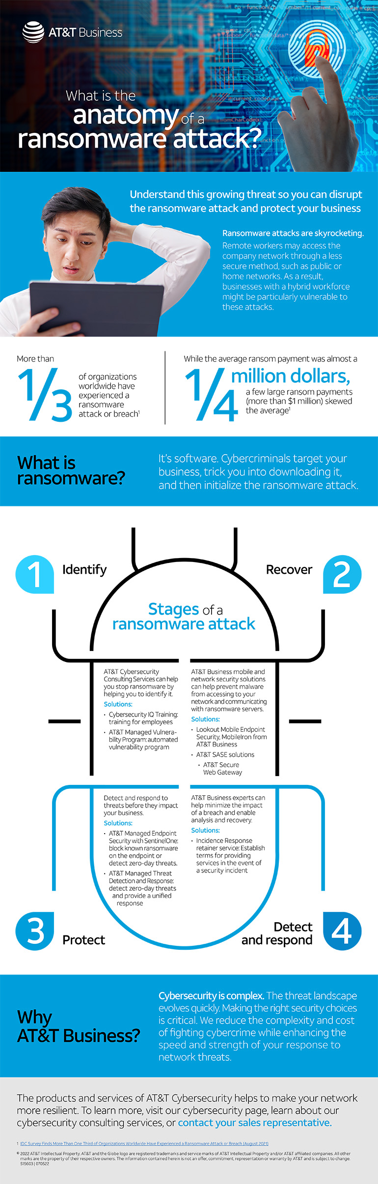 At AT&T Business, we’re committed to making your business cybersecure. To learn more, download our infographic: “What is the anatomy of a ransomware attack?”