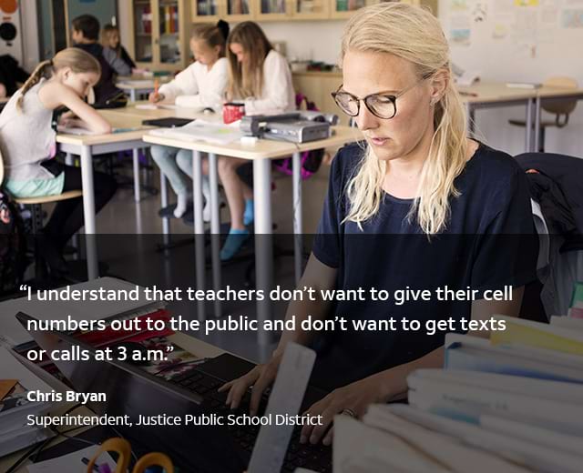 Instead of having just three phone lines for the whole district, there’s now a phone in every classroom. Teachers can call and receive calls from personal devices, and caller ID shows the school’s number instead of their private numbers.