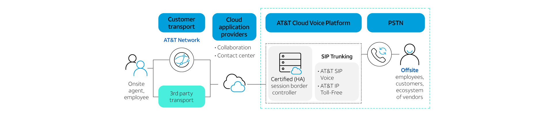 - Agent or employee connects into the leading cloud contact center provider platforms by secure AT&T Fiber or over the top internet