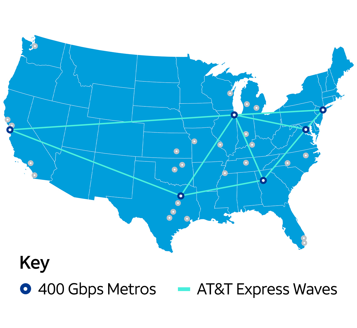 Activate pre-provisioned routes up to 400 Gbps in as little as 24 hours with AT&T Express Waves with AT&T Wavelength Long-HaulSM connectivity.